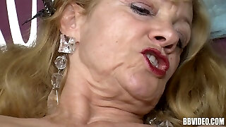 Light-haired German granny pleasing two rods with her moves