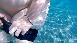 Underwater Footjob Hook-up & Nipple Squeezing POV at Public Beach - Hefty Natural Tits PAWG Plumper Wife Being Kinky on Vacation