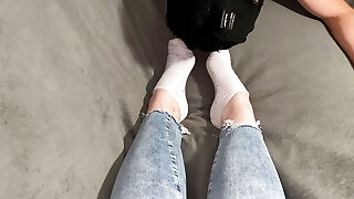 das mädchen gab einen footjob in socken und zog dann ihr höschen aus und erlaubte ihr, darin abzuspritzen