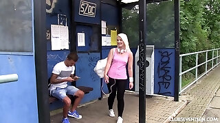 Skinny blonde amateur teen slobbers on a fat co
