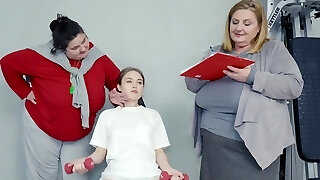 Two BBWs Make a Petite Submissive Teen Lick Their Fat Cooters And Asses In the Gym