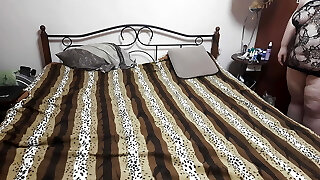 Fat timid brunette girl with humungous hairy beaver has missionary and cowgirl sex ending in a creampie on her bed